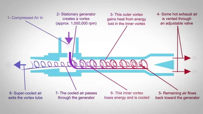 Thật sự thú vị khi chứng kiến luồng khí áp suất cao khi được bơm vào một thiết bị thì sẽ cho ra một bên là khí nóng, một bên là khí lạnh. Nhiệt độ chênh lệch có thể lên đến hàng trăm độ C.