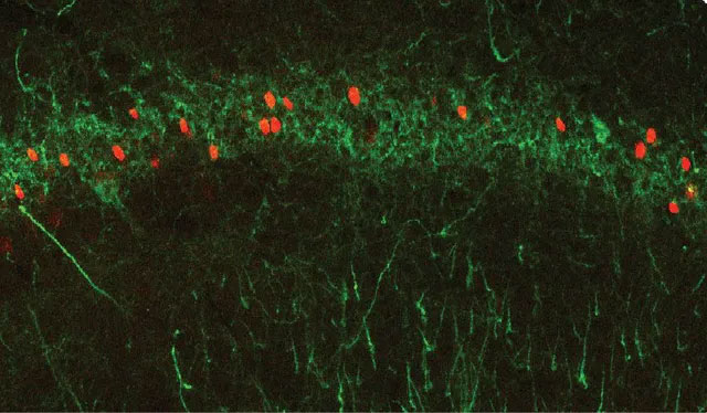 Sau khi tiếp xúc với môi trường mới, các tế bào thần kinh vùng hải mã biểu hiện gene Fos (màu đỏ) không tập trung mà nằm rải rác khắp nơi.