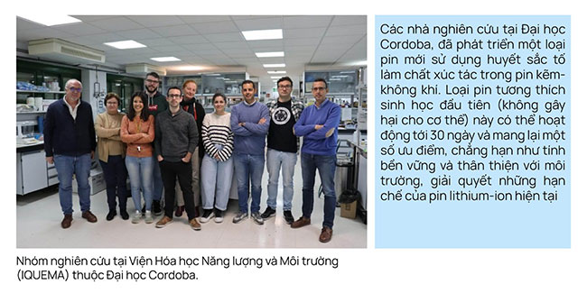 Các nhà khoa học tại Đại học Cordoba ở Tây Ban Nha đã phát triển ra cách kết hợp huyết sắc tố – thành phần chính của tế bào hồng cầu – vào pin, tạo ra một loại pin có thể hoạt động trong khoảng từ 20 đến 30 ngày.